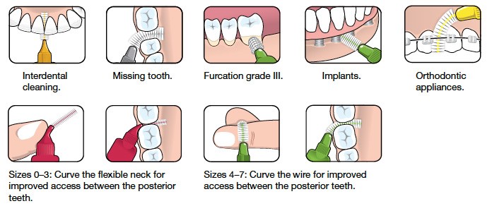 An interdental brush is to be inserted from the side of the gap that the gum and two teeth form (called interdental triangle).